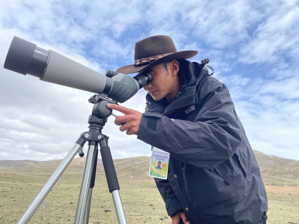 5月21日,昂旺才仁正在用望遠(yuǎn)鏡觀察鳥類活動(dòng)。 新華社記者 李琳海 攝