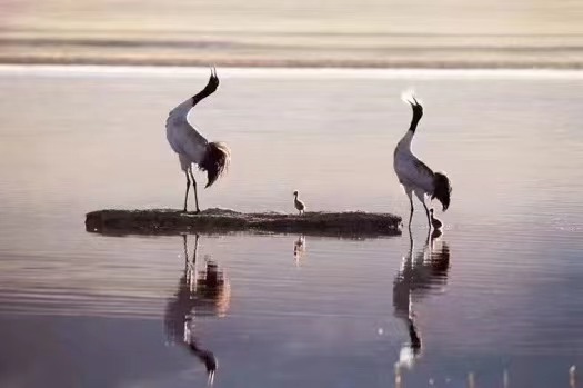 在濕地中翩翩起舞的黑頸鶴。(青海玉樹隆寶國家級(jí)自然保護(hù)區(qū)供圖)
