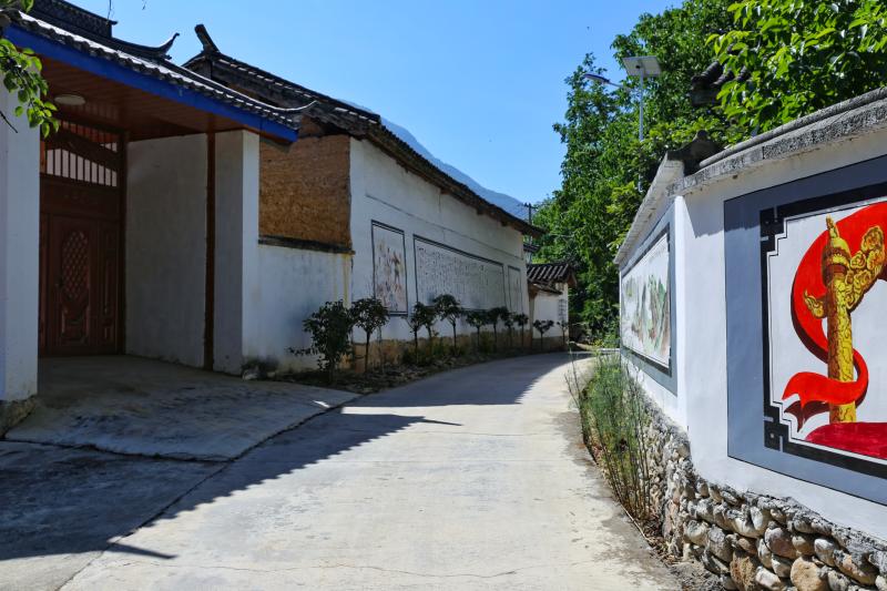 初夏時節(jié),走進香格里拉市金江鎮(zhèn)吾竹村堆滿一組,映入眼簾的是遠山青黛、碧水田園,房前屋后古樹紅花相映,鄉(xiāng)間小道兩側(cè)果樹成蔭,一幅幅包含該村文化歷史的彩繪躍然墻上,漫步其間好不愜意。
