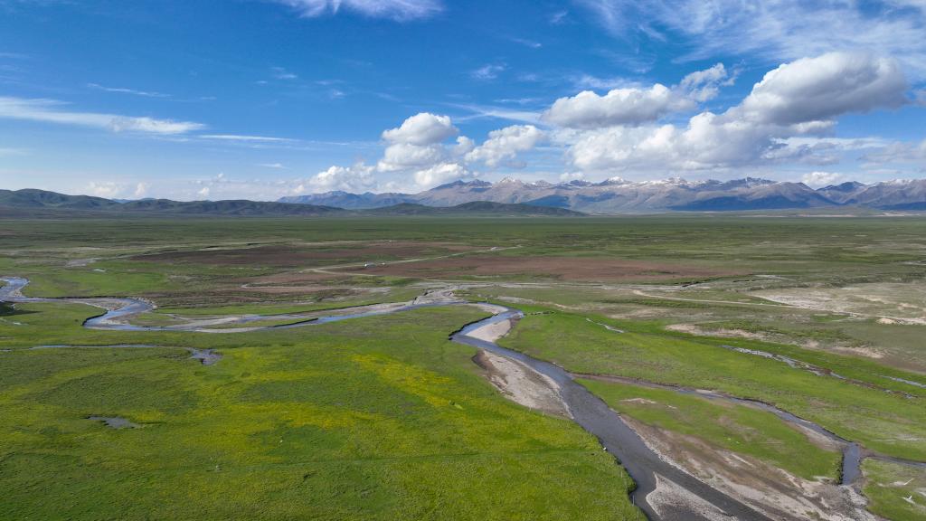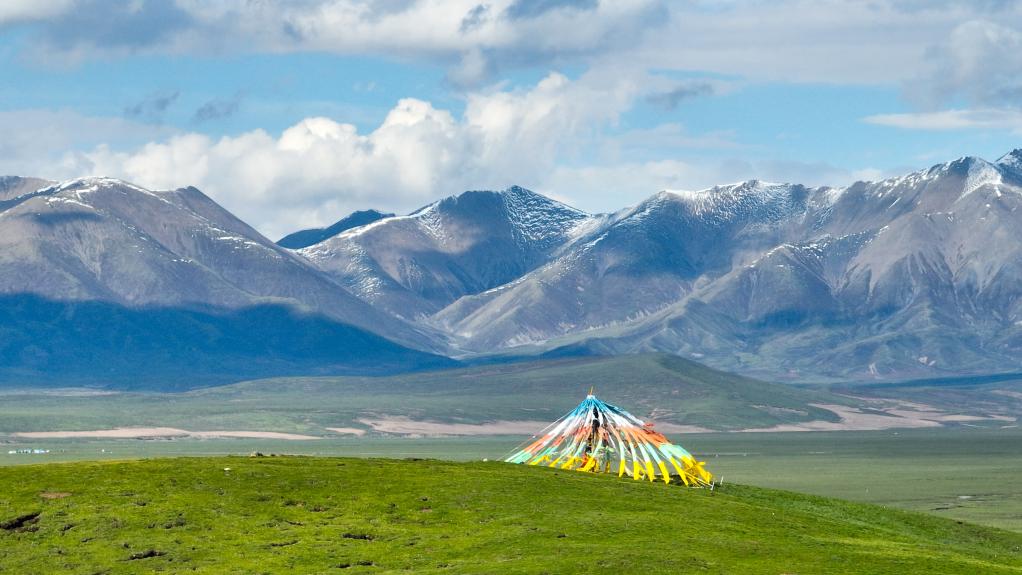 夏日,青海省南部的高原草原一碧千里,與雪山、白云相映成趣,景色宜人。