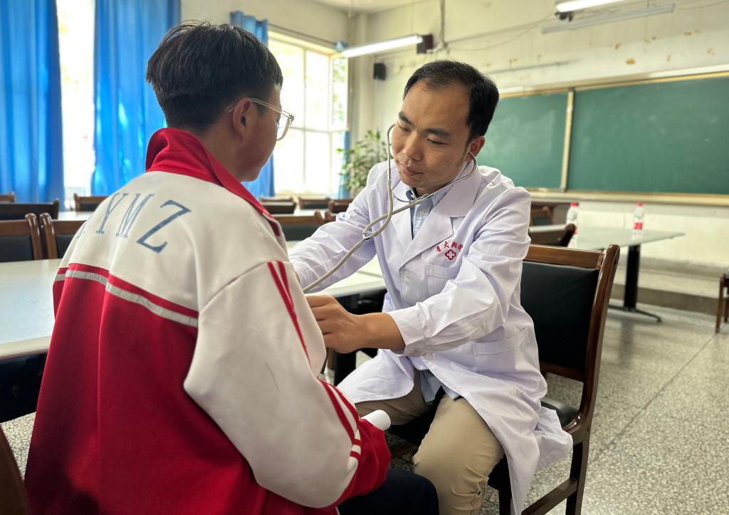 教學樓里,10名北京協(xié)和醫(yī)院的專家兩人一組,為200名學生進行骨科、眼科、兒科綜合檢查?!翱凑胺?。佩戴眼鏡后一定要按期復查。課間可以摘下眼鏡按摩一下,避免過度用眼?!北本﹨f(xié)和醫(yī)院眼科專家李冰一邊拿著檢眼鏡細心檢查,一邊耐心地講解用眼知識。