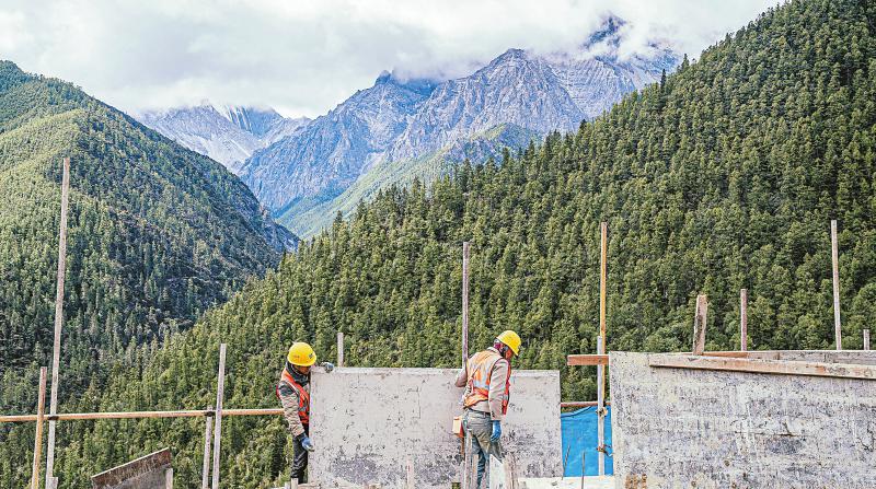 來到亞丁村中心,在一棟“黑藏房”的第三層,工人們正在施工?!澳銈兛?,旁邊這棟房子就是傳統(tǒng)樣式,是一戶一幢、二樓一底的結(jié)構(gòu),第三層中間會有一個露臺,呈‘凹’字形,但過去出租房屋的村民和民宿老板為了多建幾間客房,在第三層的露臺加蓋了房間?!蓖豕鹎钢慌缘慕ㄖf,“現(xiàn)在我們整體打造后,會還原這個露臺?!?/p>