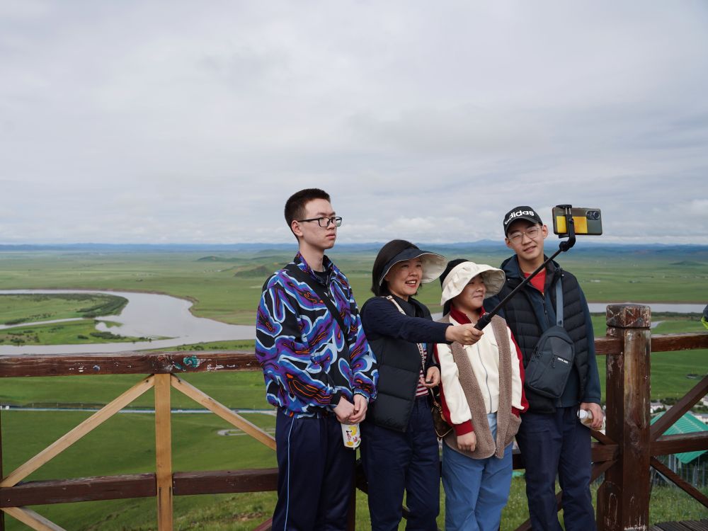 7月14日,游客在若爾蓋縣黃河九曲第一灣景區(qū)內(nèi)拍照。新華社記者 邢拓 攝