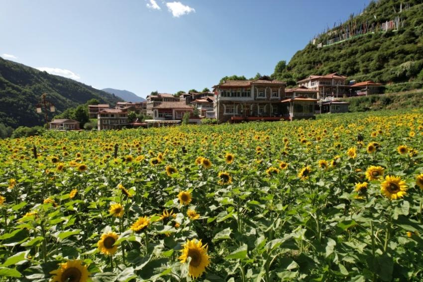 “天蒼蒼,野茫茫,風吹草低見牛羊?!标柟饷髅牡南募荆诩t原縣公路兩邊隨處可見悠然吃草的牦牛和藏綿羊,令人心曠神怡。