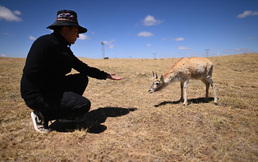 在可可西里國(guó)家級(jí)自然保護(hù)區(qū)索南達(dá)杰保護(hù)站,巡山隊(duì)員扎西桑周在野生動(dòng)物救助中心內(nèi)與一只被救助的小藏羚羊互動(dòng)(5月30日攝)。新華社記者 張宏祥 攝