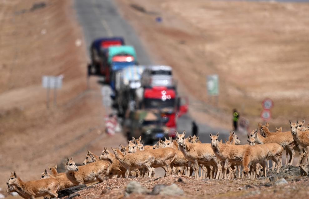 遷徙產(chǎn)仔季,在可可西里五道梁保護(hù)站附近,記者經(jīng)常看到,成群的雌性藏羚羊,在頭羊帶領(lǐng)下,邁著小碎步,整齊而迅速地穿過(guò)青藏公路。往來(lái)車(chē)輛在工作人員指揮下排起長(zhǎng)長(zhǎng)的隊(duì)伍,沒(méi)有鳴笛、沒(méi)有圍觀,只有讓行,一切如此自然。