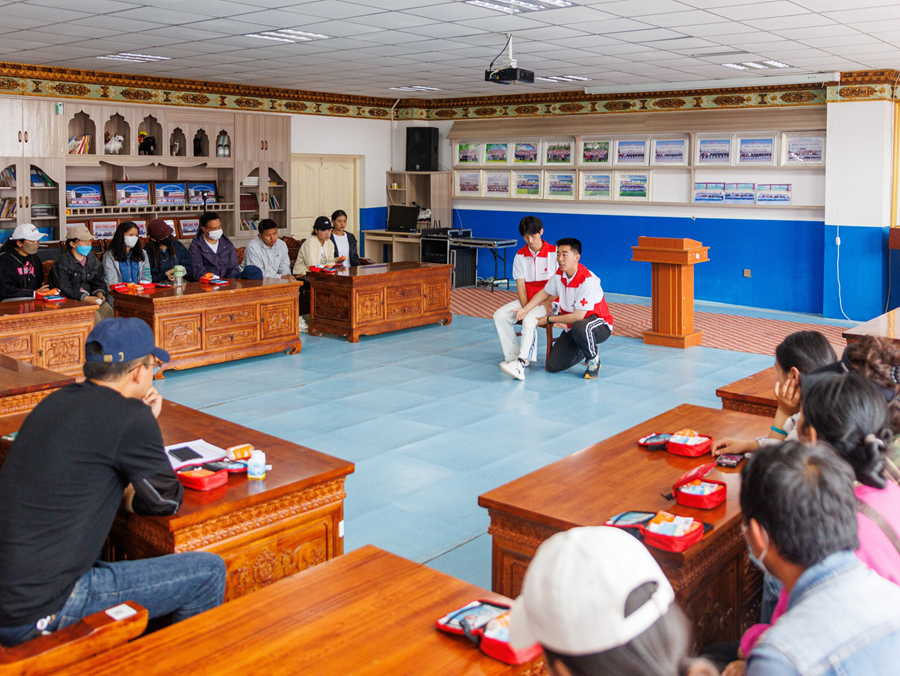 依托紅十字會專業(yè)基礎(chǔ),支教隊(duì)開設(shè)了應(yīng)急救護(hù)課堂教學(xué)活動,從海姆立克急救法、三角巾的使用等基礎(chǔ)技能著手,結(jié)合“理論+實(shí)踐”為師生開展了一次生動的急救培訓(xùn)。課堂上,AED的使用以及心肺復(fù)蘇、急救包扎等應(yīng)急技能的教學(xué)齊頭并進(jìn),讓師生們學(xué)到了科學(xué)的應(yīng)急救護(hù)知識。課程結(jié)束后,支教隊(duì)在校園多地放置了急救包,為師生提供基礎(chǔ)的應(yīng)急保障。