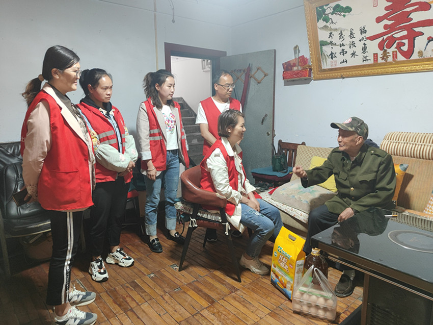 圖為光明社區(qū)工作人員慰問(wèn)老人。