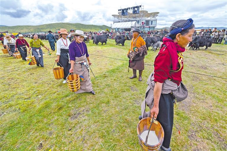 圖為8月25日,在四川省阿壩藏族羌族自治州紅原縣雅克音樂牧場,參賽者在比賽結(jié)束后提著擠出的牦牛奶去稱重。新華社記者 王曦 攝