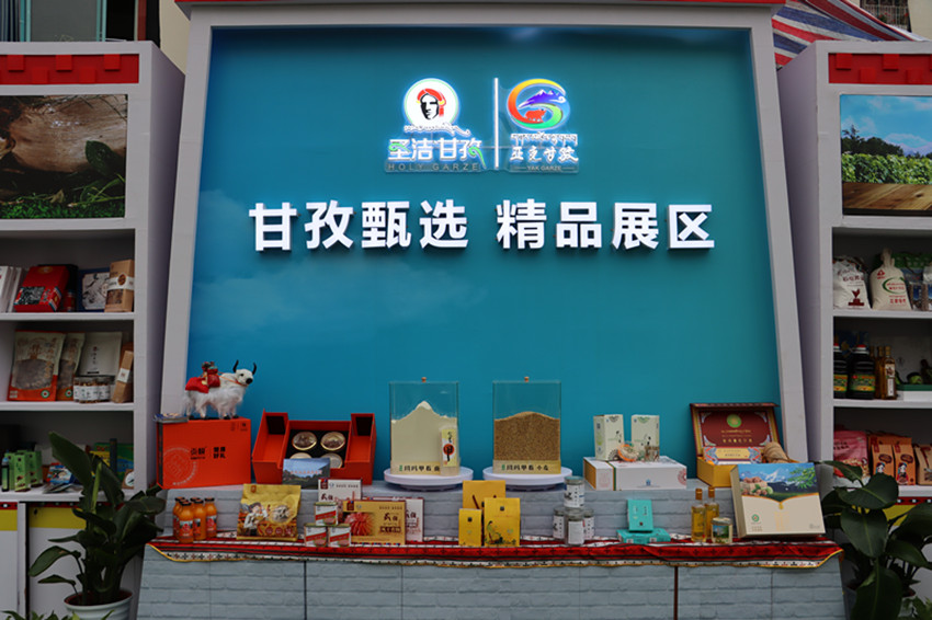 甘孜州各縣(市)的農(nóng)特產(chǎn)品吸引現(xiàn)場不少嘉賓、群眾紛紛圍觀搶購。