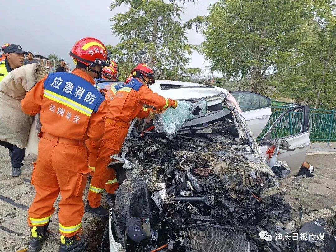 接到調(diào)令后,香格里拉消防救援站立即出動2車13人前往處置,到達現(xiàn)場后,發(fā)現(xiàn)一輛小轎車與一輛貨車相撞,轎車嚴重受損變形,車內(nèi)安全氣囊已彈出,副駕駛位被困人員頭部、腿部多處受傷無法動彈,意識模糊,有嚴重生命危險。
