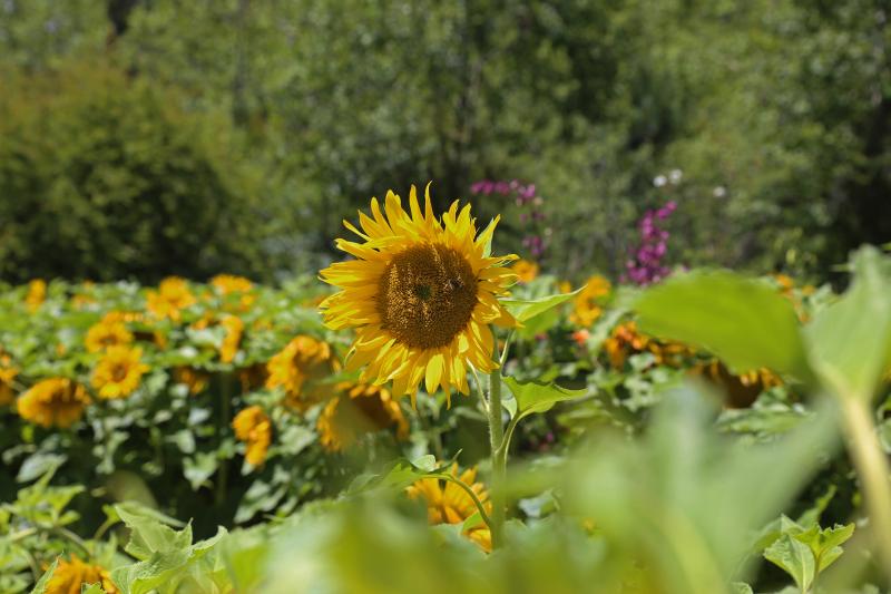 田間萬壽菊、百日菊、黑心菊、向日葵等簇?fù)硎⒎牛f里晴空下,朵朵菊花在秋風(fēng)中搖曳生姿,蜜蜂飛舞、蝴蝶翩躚,繪出了一幅色彩繽紛的秋日畫卷,令人賞心悅目。