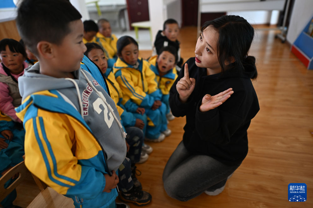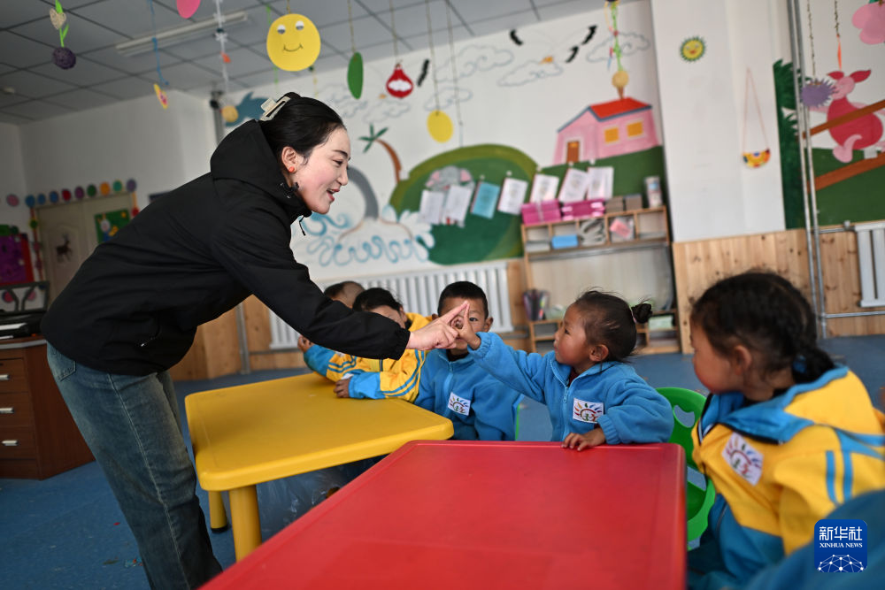 在曲麻萊縣秋智鄉(xiāng)幼兒園,教師索南(左一)在課堂上和義西卓瑪(右二)玩游戲(9月13日攝)。新華社 張宏祥 攝