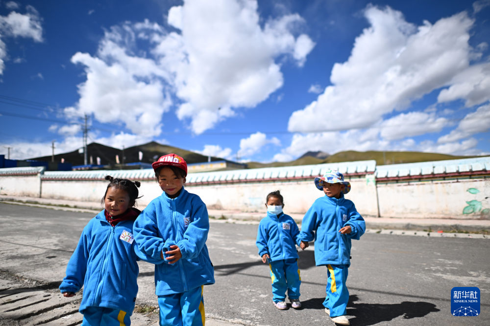 在曲麻萊縣秋智鄉(xiāng),仁青卓瑪(左二)和伙伴們一起進(jìn)入幼兒園(9月13日攝)。新華社 張宏祥 攝