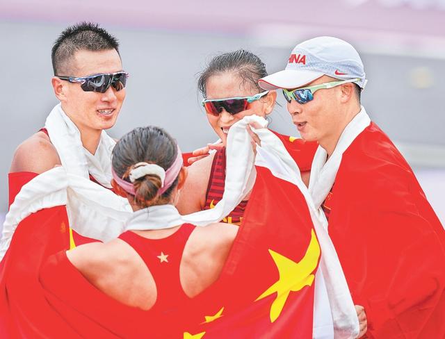 男女混合35公里競走團體決賽中,中國隊以5小時16分41秒的成績獲得冠軍,日本隊獲得亞軍,印度隊獲得季軍。圖為中國隊選手在奪冠后慶祝。 新華社記者 孫非攝