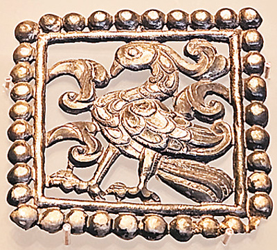 “青海都蘭熱水墓群精品文物展”展出的立鳳銀飾片。趙曉霞 攝
