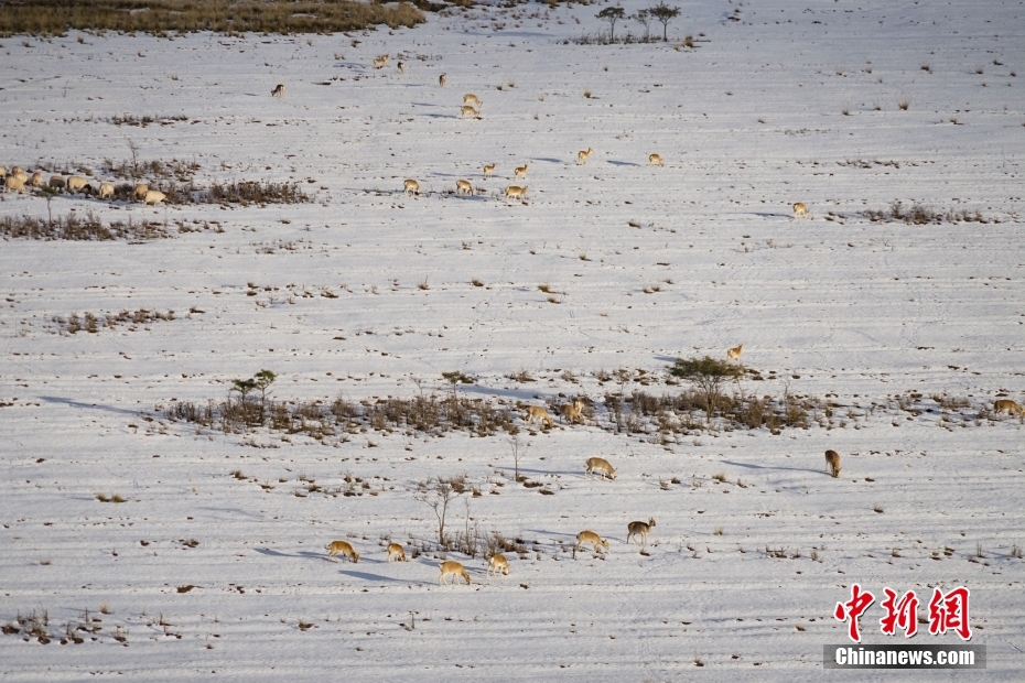 10月12日,成群普氏原羚在青海湖北岸雪中覓食、漫步。當(dāng)日,在青海湖北岸的青海省海北藏族自治州剛察縣哈爾蓋“羚羊小鎮(zhèn)”,成群的普氏原羚在雪中覓食、漫步。普氏原羚是世界瀕危物種、國家一級(jí)重點(diǎn)保護(hù)野生動(dòng)物,現(xiàn)僅分布于青海湖周圍,成為青海湖獨(dú)有的珍稀有蹄類動(dòng)物和旗艦物種。中新社記者 馬銘言 攝