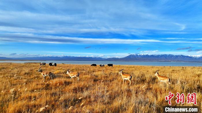 近日,在地處柴達木盆地的青海省海西州烏蘭縣的都蘭湖國家濕地公園內(nèi),出現(xiàn)了黑頸鶴、鵝喉羚多種野生動物“同框”的畫面。