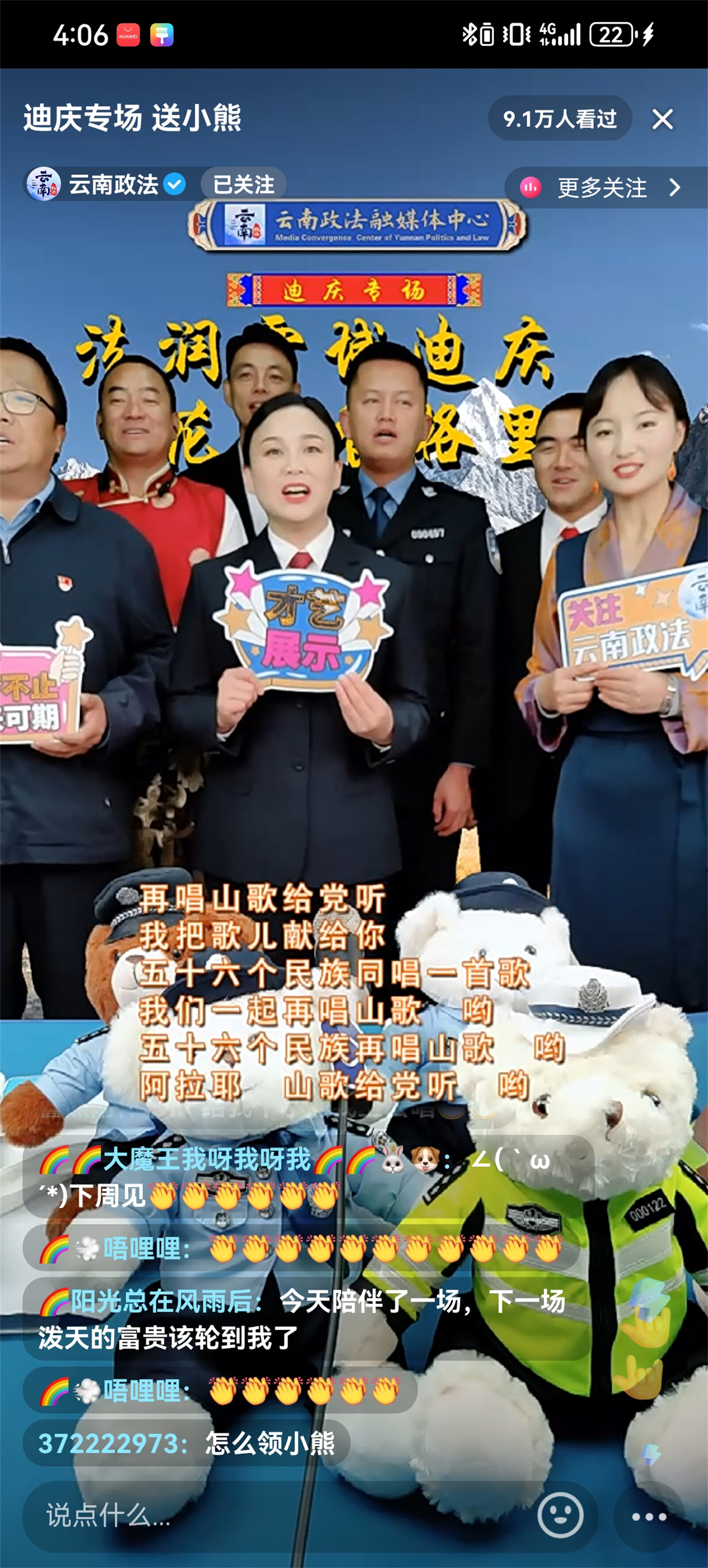 近日,迪慶州政法干警走進(jìn)云南政法普法強(qiáng)基直播間開展“法潤雪域迪慶、花開香格里拉”迪慶州普法專場直播,直播聚焦群眾關(guān)切,緊密聯(lián)系時事熱點,帶廣大網(wǎng)友體驗了一場內(nèi)容豐富的普法之旅,共吸引9.1萬人觀看,獲點贊超10.4萬。