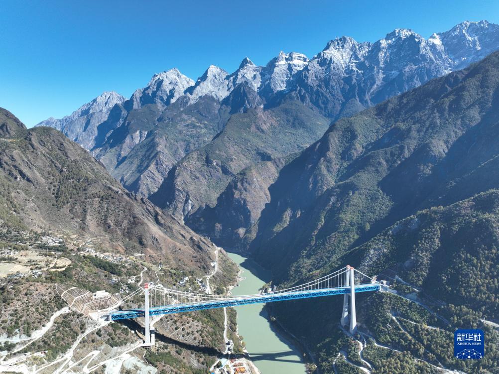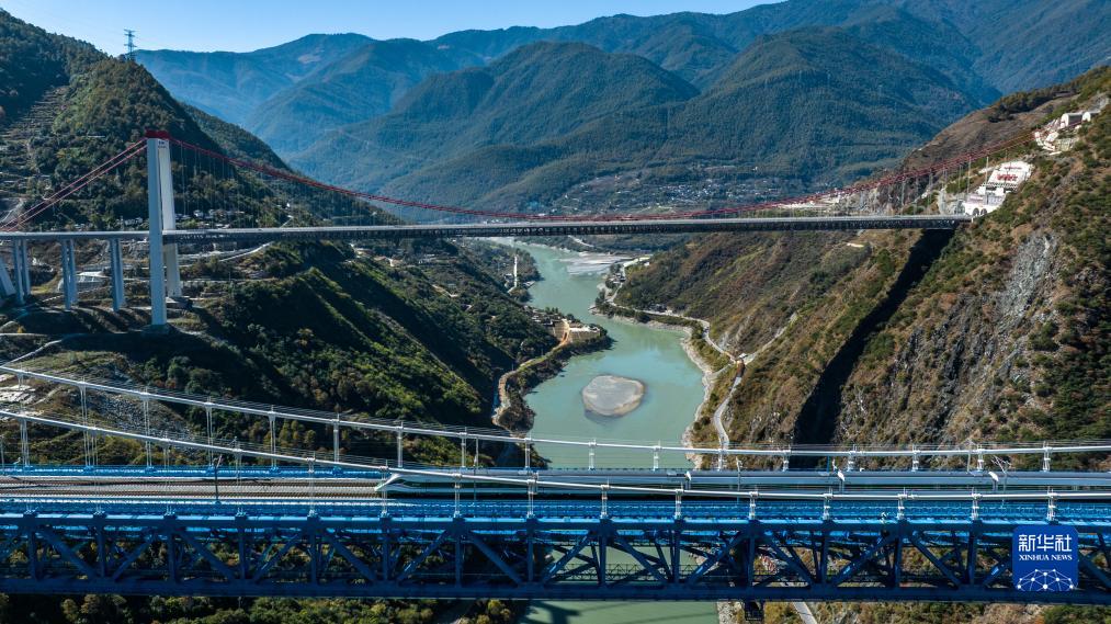 11月26日,列車駛過虎跳峽金沙江鐵路大橋(無人機(jī)照片)。新華社記者 胡超 攝