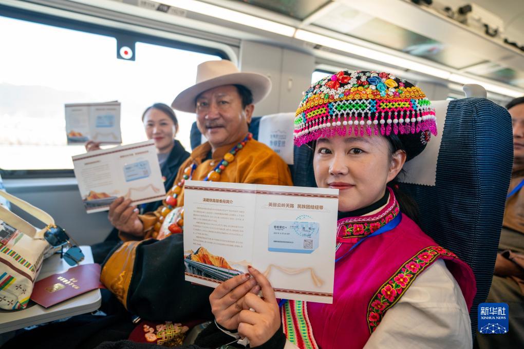 11月26日,乘坐麗香鐵路開通首發(fā)列車的嘉賓在車廂內(nèi)展示紀(jì)念車票。新華社記者 陳欣波 攝
