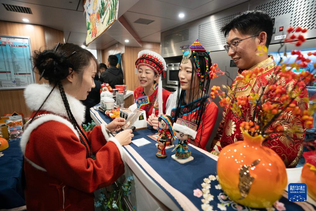 11月26日,乘坐麗香鐵路首發(fā)列車的乘客(左)向列車乘務(wù)員咨詢紀(jì)念品。新華社記者 陳欣波 攝