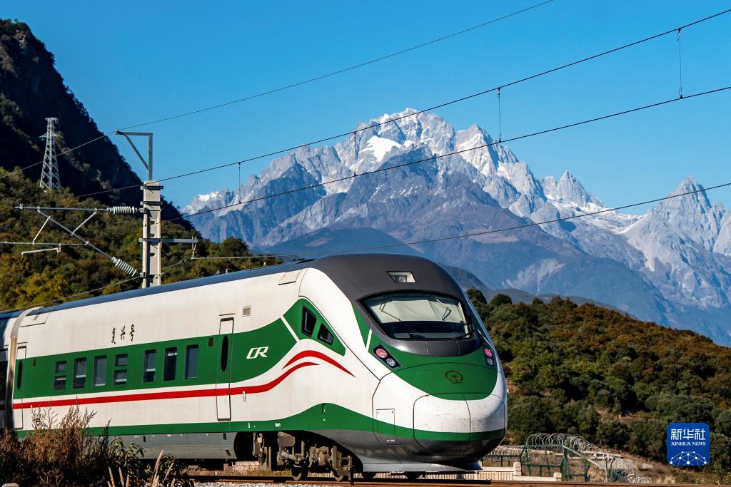 11月26日,列車從玉龍雪山腳下駛過。新華社記者 邢廣利 攝