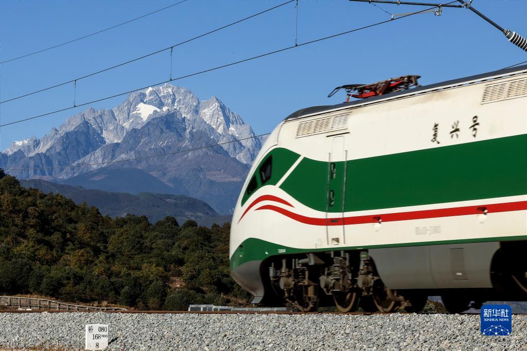 11月26日,列車從玉龍雪山腳下駛過。新華社記者 胡超 攝