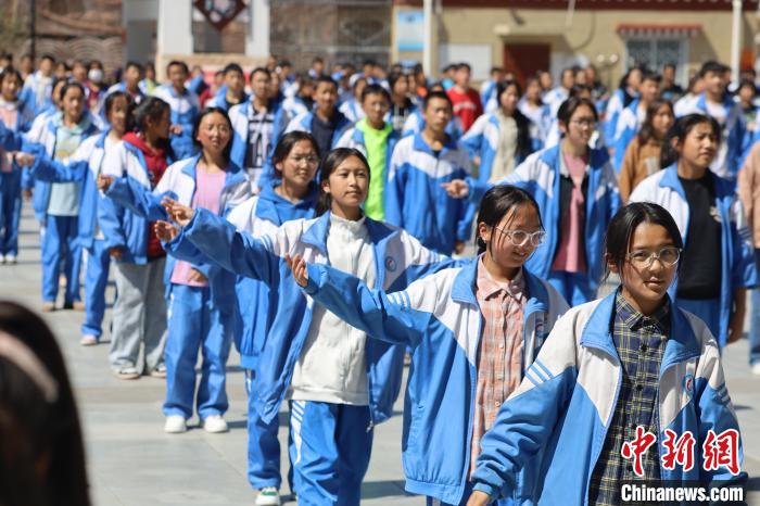 一陣急促的鈴聲響起,課間操時(shí)間到了。藍(lán)天白云下,學(xué)生們?cè)诓賵?chǎng)上跳起藏族特色的鍋莊舞。操場(chǎng)邊,35歲的藏文老師洛登也跟著音樂跳了起來。