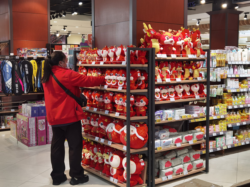 農(nóng)貿(mào)市場(chǎng)一片火熱景象,而在各大超市里,各種龍年喜慶元素的年貨擺在貨架最顯眼的位置,增添了不少節(jié)日氛圍。顧客以年輕人居多,購(gòu)物車(chē)?yán)锇b精美的各類(lèi)產(chǎn)品琳瑯滿目。