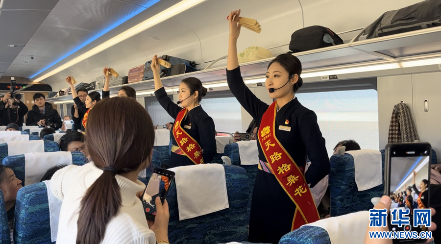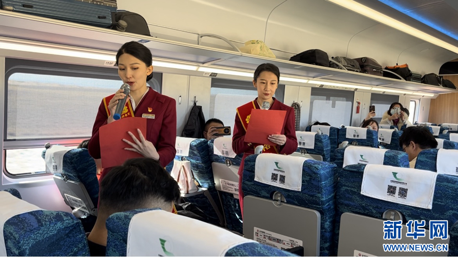 車廂內(nèi),喜慶的燈籠高高掛起,紅色的對(duì)聯(lián)、剪紙點(diǎn)綴其間,濃厚的新年氛圍撲面而來。過道里,乘務(wù)員們的律動(dòng)操、音樂快板、詩(shī)朗誦等精彩節(jié)目令人目不暇接,乘客們紛紛拿起手機(jī)拍照錄像記錄。