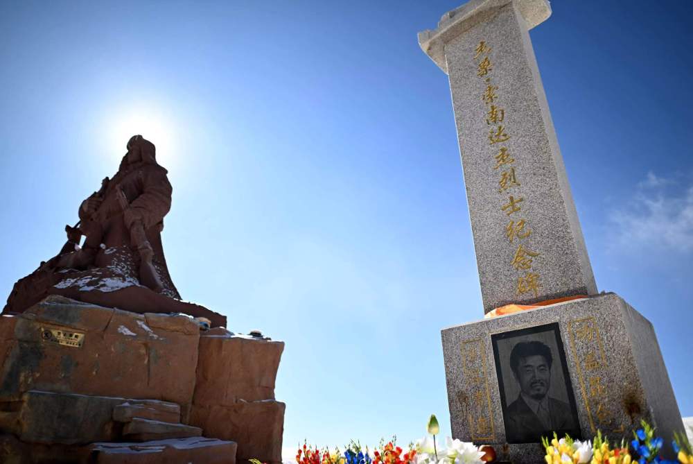 雕像前,紀(jì)念人群低頭默哀?!案母锵蠕h、最美奮斗者、環(huán)保衛(wèi)士”,當(dāng)?shù)馗刹空f,索南達杰用生命守護青藏高原的精靈藏羚羊。