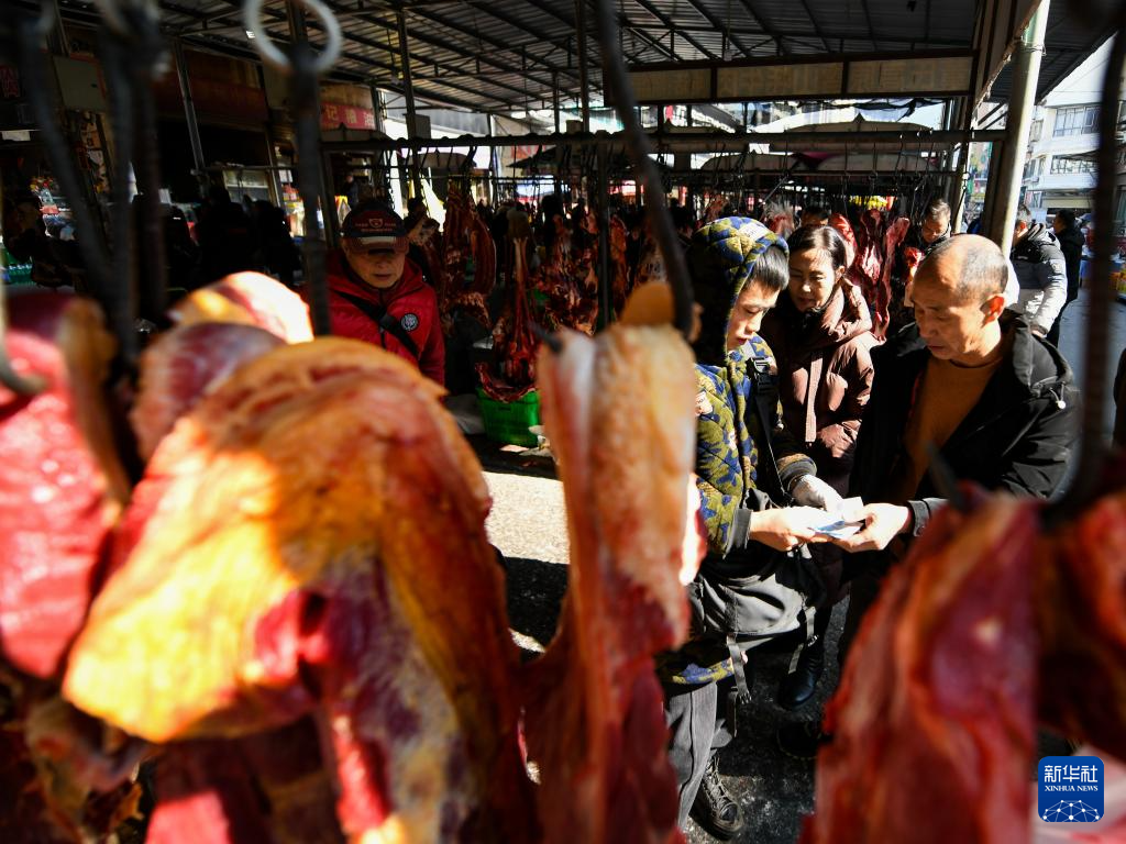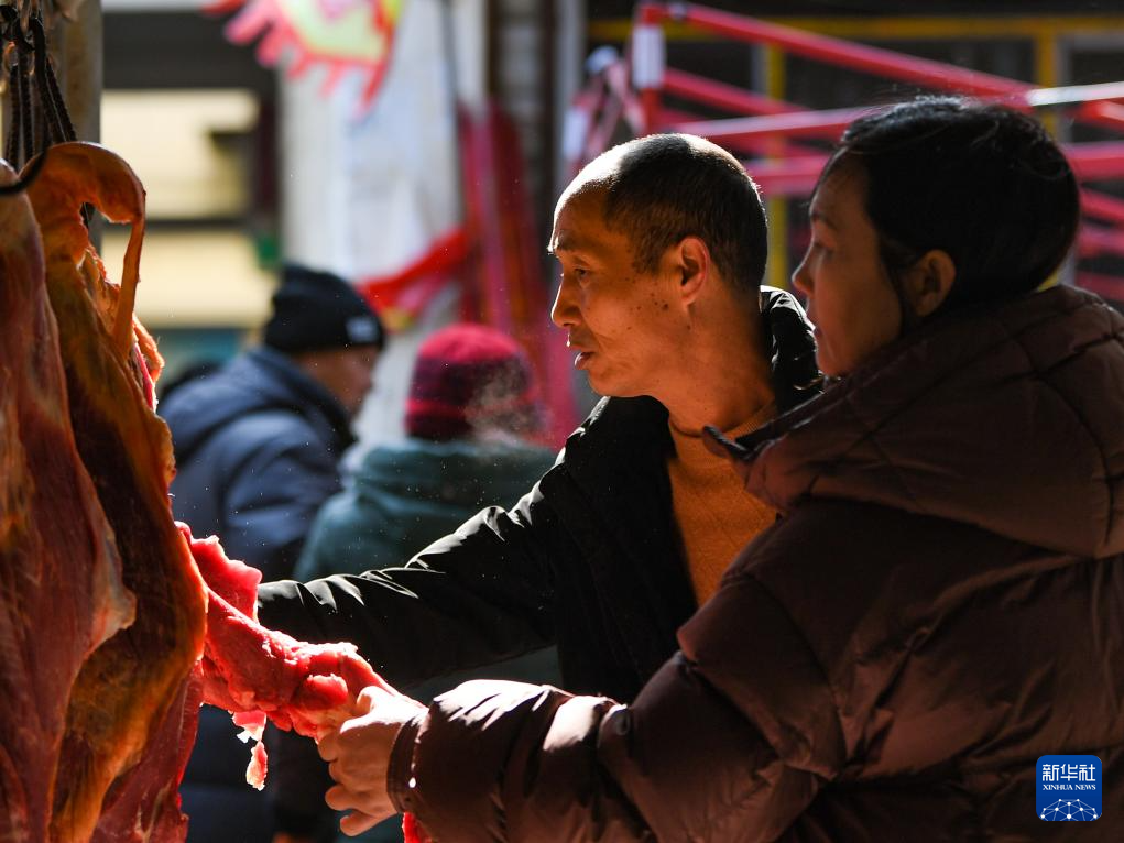 1月28日,游客在四川阿壩藏族羌族自治州茂縣農(nóng)貿(mào)市場(chǎng)選購牦牛肉。新華社記者 王曦 攝