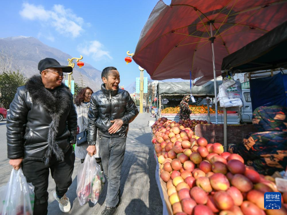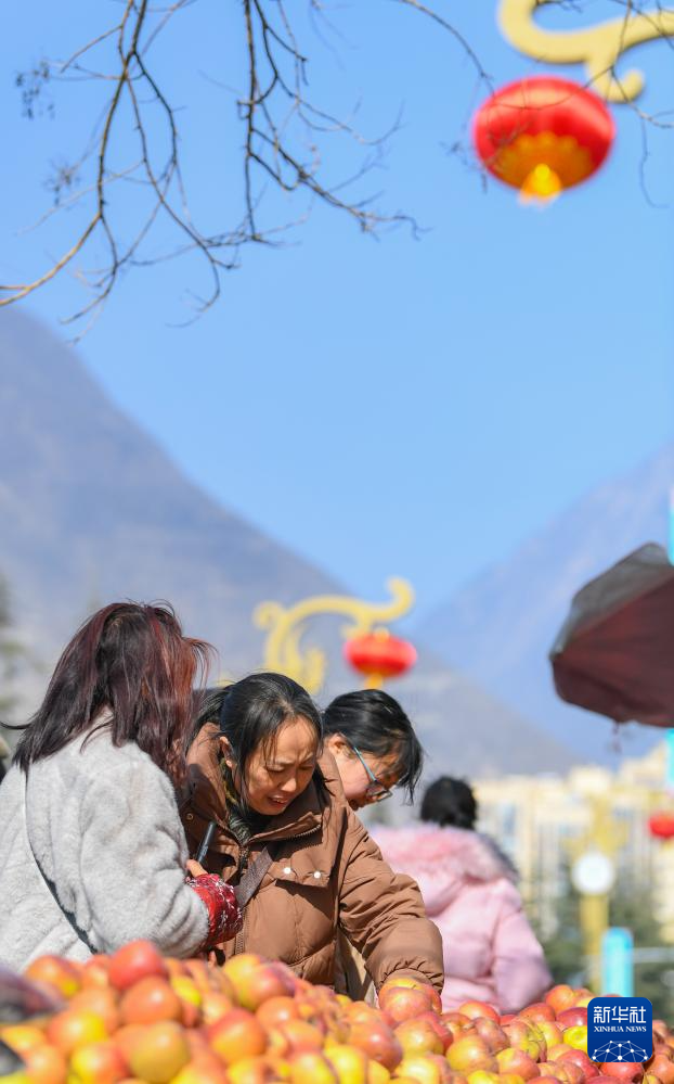 1月28日,在四川阿壩藏族羌族自治州茂縣水果交易市場(chǎng),來自成都的游客在選購蘋果。新華社記者 王曦 攝