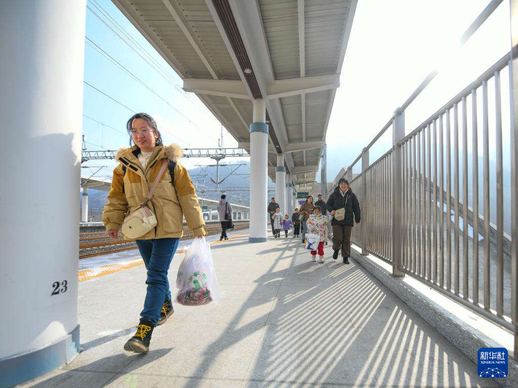 1月28日,在川青鐵路茂縣站,旅客帶著購買的蘋果準(zhǔn)備登車。新華社記者 王曦 攝