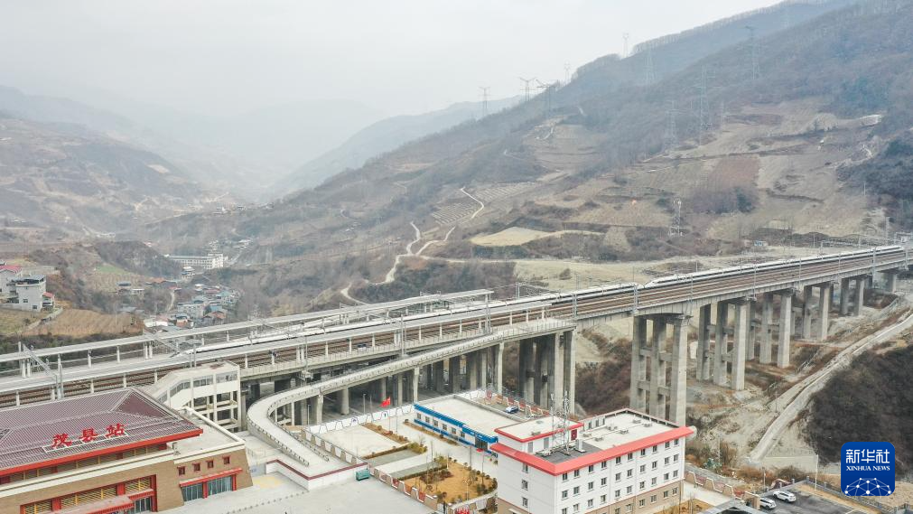 1月28日,一列動(dòng)車組駛出川青鐵路茂縣站(無人機(jī)照片)。新華社記者 王曦 攝