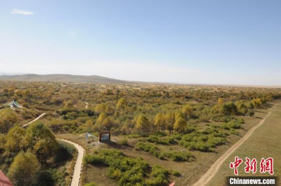資料圖為航拍海南州貴南縣黃沙頭防沙治沙“綠進沙退”。海南州委宣傳部供圖