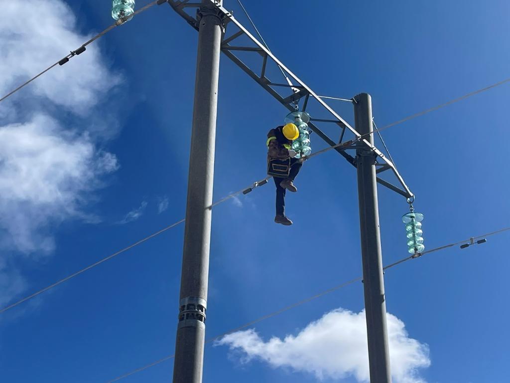 風(fēng)吹得高壓線輕輕晃動,鐵軌兩邊都被白雪覆蓋,大家剛一下車就感受到了來自唐古拉的寒意?!敖裉鞕z修任務(wù)是布強格至唐古拉北45號桿塔至245號桿塔,重點是線路、絕緣子檢修、鐵塔、電桿狀態(tài)檢查等工作,海拔高、氣溫低,裝備穿戴笨重,登高作業(yè)大家要注意防止跌倒、墜落。”應(yīng)忠學(xué)怕自己的聲音被風(fēng)吹得模糊,他又大聲喊了一遍,保證每個人都能聽到。