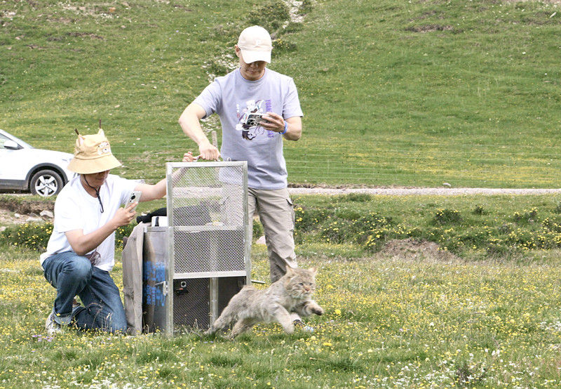 2023年7月23日,在青海省海北藏族自治州海晏縣,西寧野生動(dòng)物園副園長(zhǎng)齊新章(左一)和中國(guó)農(nóng)業(yè)大學(xué)動(dòng)物醫(yī)學(xué)院副院長(zhǎng)金藝鵬放歸荒漠貓“黃太急”。(西寧野生動(dòng)物園供圖)