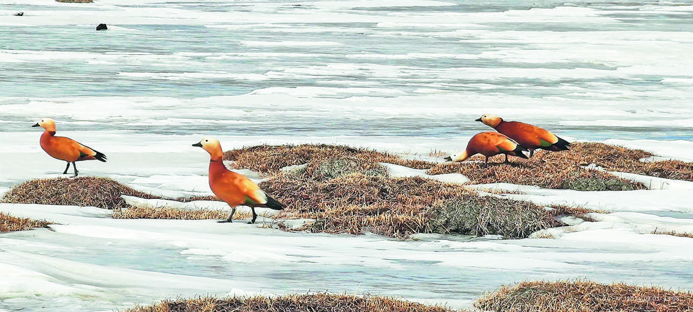 3月8日,青海省玉樹(shù)藏族自治州隆寶灘國(guó)際重要濕地迎來(lái)春天首批赤麻鴨12只,身披赤黃褐色的“彩衣”赤麻鴨,或游走在草灘上棲息覓食,或展翅翱翔天空,或在冰面上歇息,讓隆寶灘國(guó)際重要濕地在春季充滿了勃勃生機(jī)。