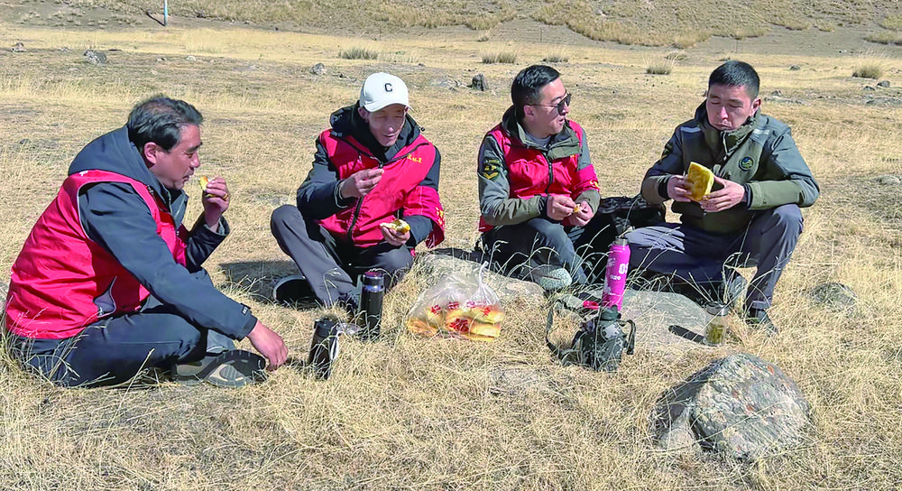 “我們巡護(hù)的路比較遠(yuǎn)也很難走,說實(shí)話很辛苦,但在這個崗位上能最大限度保護(hù)國家公園的林區(qū)、草原和野生動植物,心里非常自豪?!?月7日12時(shí)左右,上午的巡護(hù)暫時(shí)告一段落,祁連山國家公園邊麻管護(hù)站副站長賈才讓東珠和同事席地而坐,從背包里掏出饃饃、開水,吃起了午飯。
