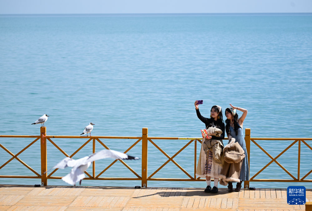 4月11日,游客在青海湖畔的東格爾觀魚臺(tái)拍照。新華社記者 張龍 攝