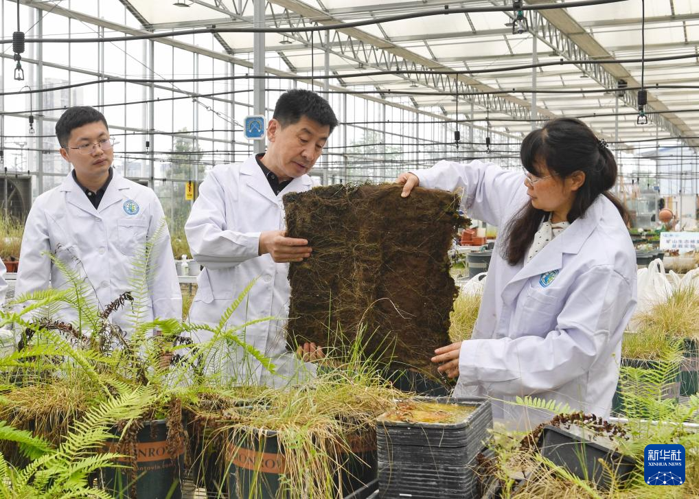 4月20日,在成都理工大學(xué)生態(tài)環(huán)境學(xué)院教學(xué)實(shí)踐基地內(nèi),裴向軍(中)及團(tuán)隊(duì)成員在展示其利用退化草皮培育的植生塊。新華社記者 劉坤 攝