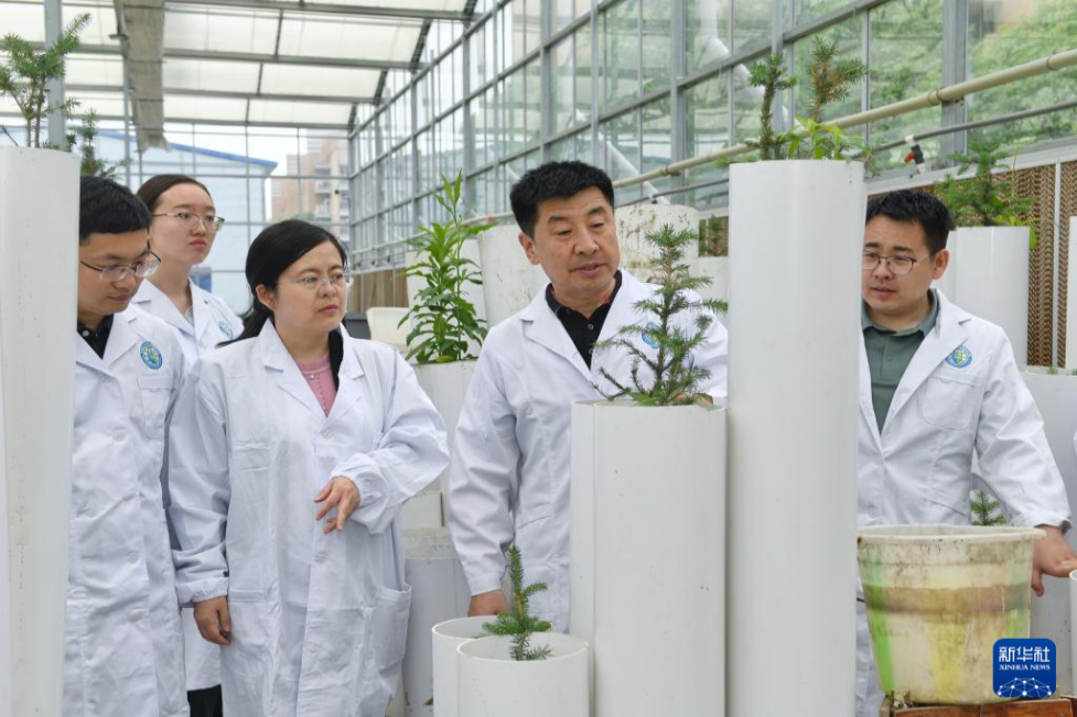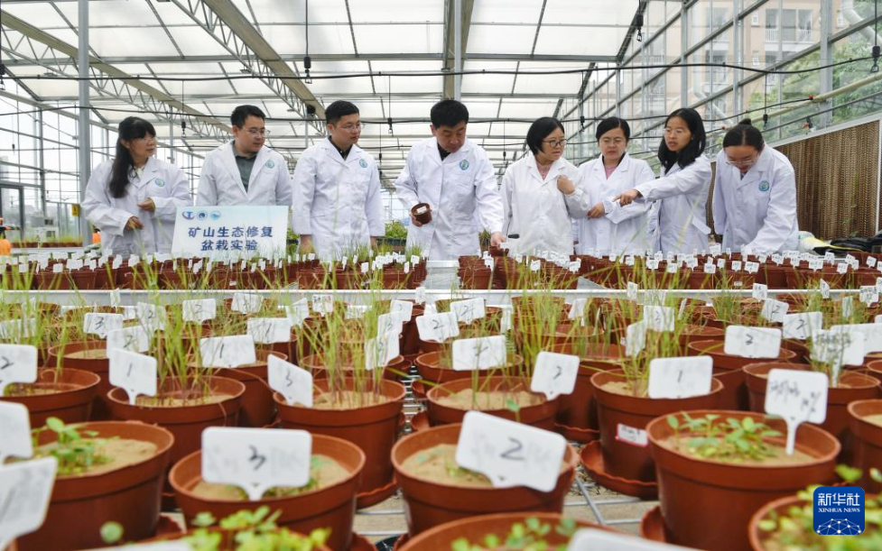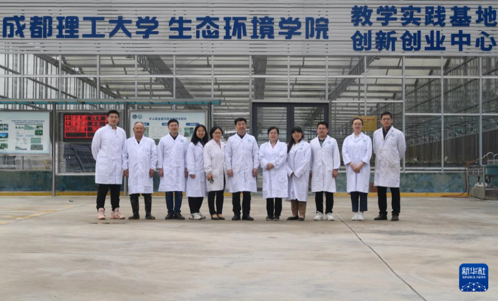 4月20日,在成都理工大學(xué)生態(tài)環(huán)境學(xué)院教學(xué)實(shí)踐基地內(nèi),裴向軍(左四)及團(tuán)隊(duì)成員在討論礦山生態(tài)修復(fù)盆栽實(shí)驗(yàn)。新華社記者 劉坤 攝