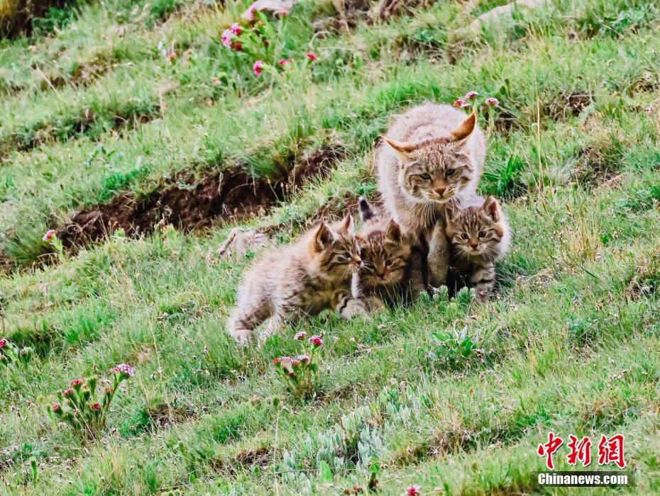 圖為荒漠貓幼崽與媽媽一起“踏青”。嚴(yán)桉 攝