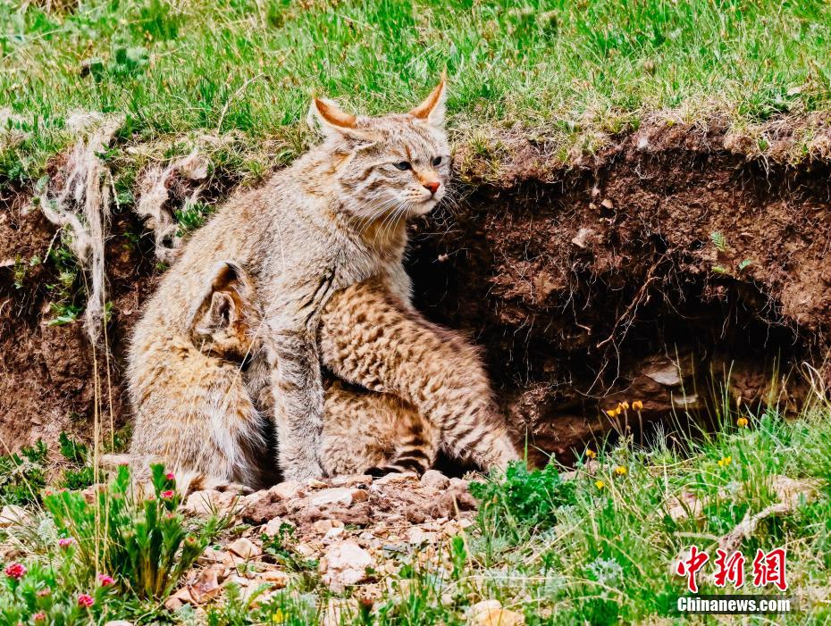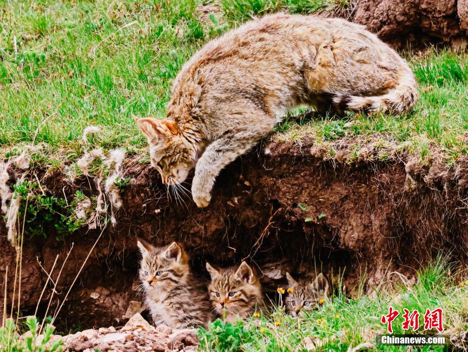 6月15日,盛夏時節(jié),在青海省海北藏族自治州海晏縣哈勒景蒙古族鄉(xiāng)查庫太草原上,攝影愛好者拍攝到荒漠貓幼崽出窩“踏青”的畫面。畫面中,荒漠貓幼崽或是與媽媽嬉戲玩耍,或是“哥仨”追逐打鬧,或是練習(xí)捕獵技巧,甚是呆萌可愛?;哪埛植加谇嗖馗咴瓥|部,是中國特有的貓科動物,國家一級重點保護(hù)野生動物。