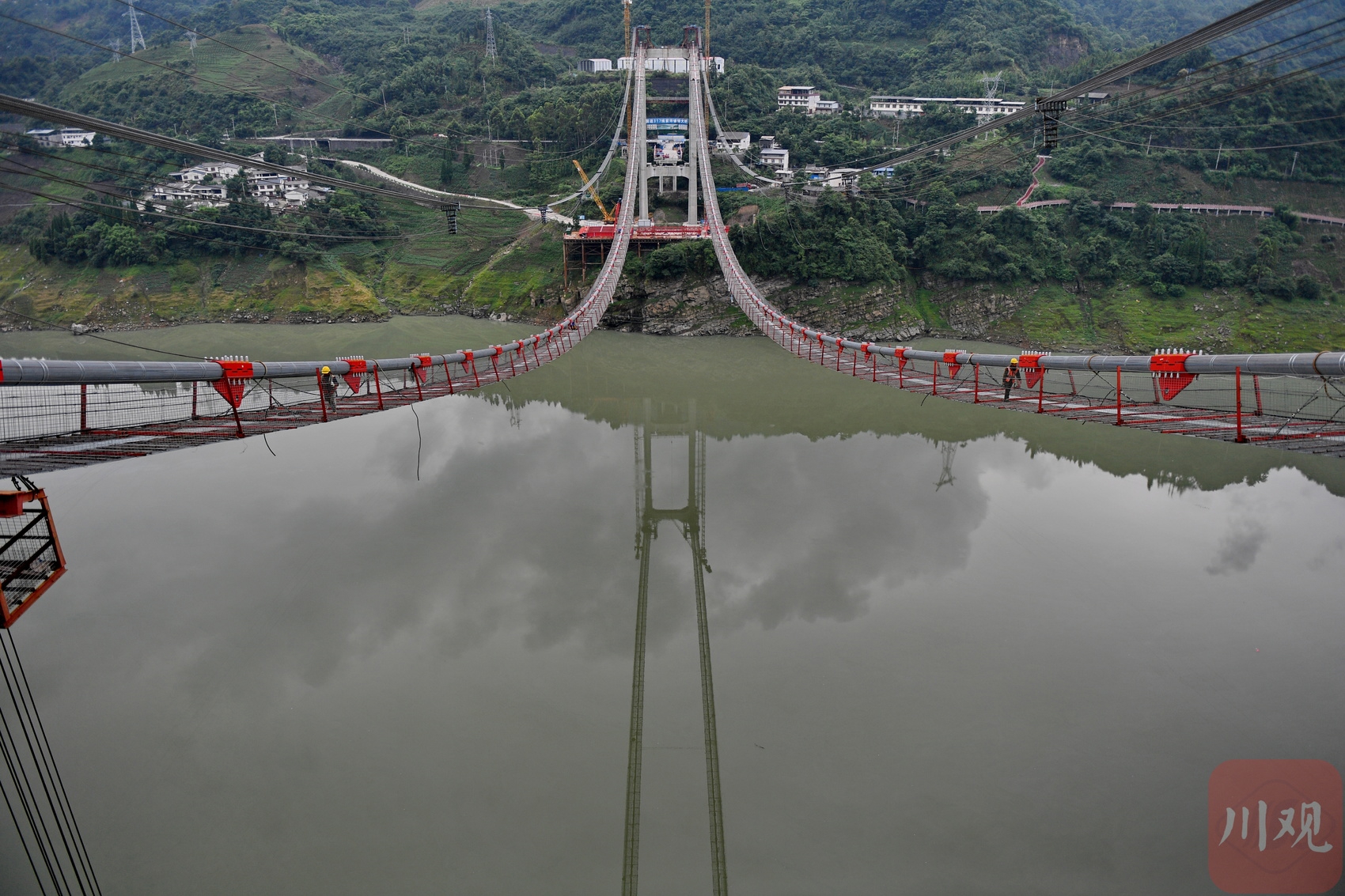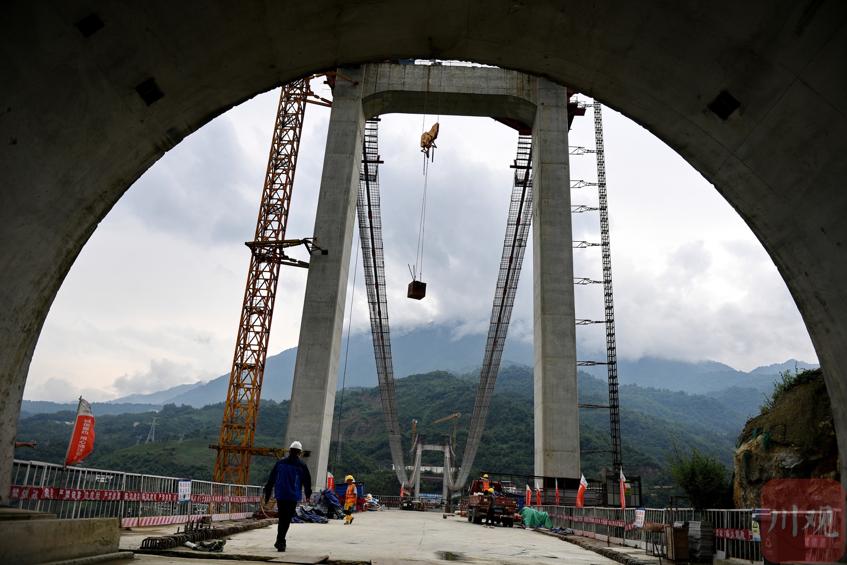 由中交路橋建設(shè)有限公司承建的國道317線友誼隧道至映秀段改建工程項目路線全長12.77公里,都江堰市境內(nèi)約0.92公里,汶川縣境內(nèi)約11.85公里。其控制性工程紫坪鋪特大橋是主跨485米橫跨岷江紫坪鋪水庫的懸索橋,為“反括弧”空間線型主纜懸索橋,是阿壩州第一座懸索橋,也是全國最大跨徑“反括弧”空間線型主纜懸索橋。其主纜上下游各設(shè)48根通長索股,單根索股長802米,每根索股由127根直徑為5.3毫米的高強鍍鋅鋼絲組成,目前已完成整個工程量的70%,預計今年主體工程完工。