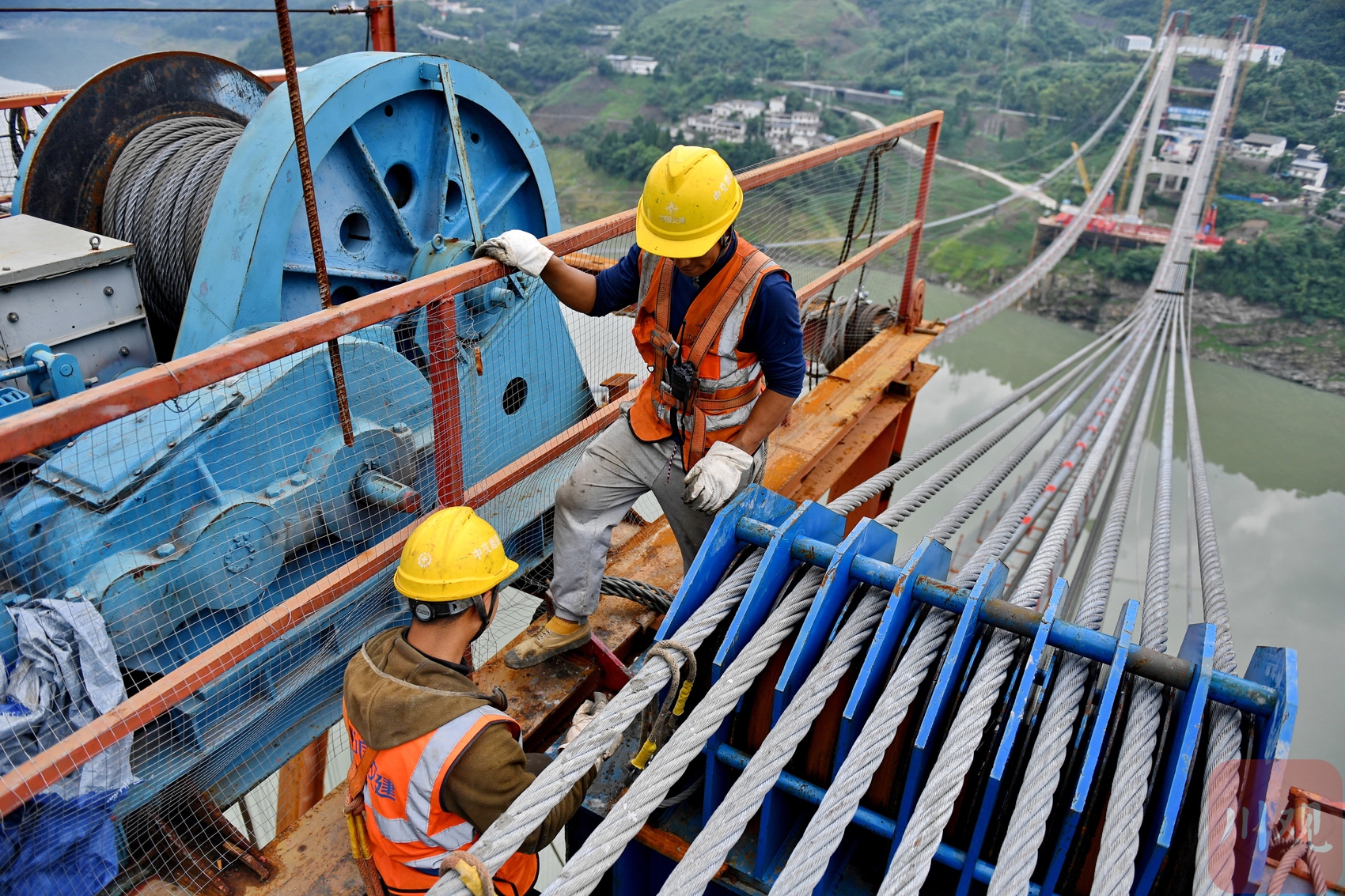 施工人員在懸索橋主纜上作業(yè)。李向雨 攝