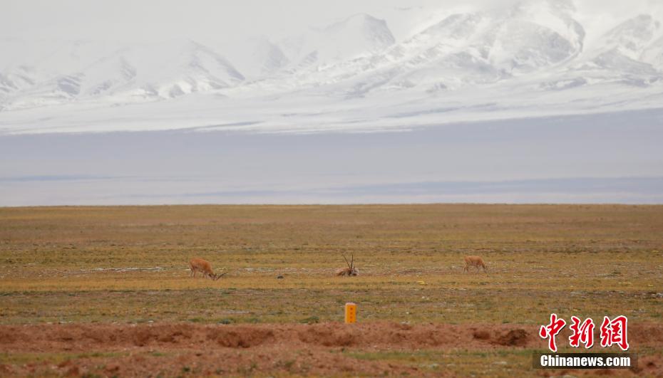 6月20日,可可西里藏羚羊在青藏公路一側(cè)覓食。中新社記者 馬銘言 攝