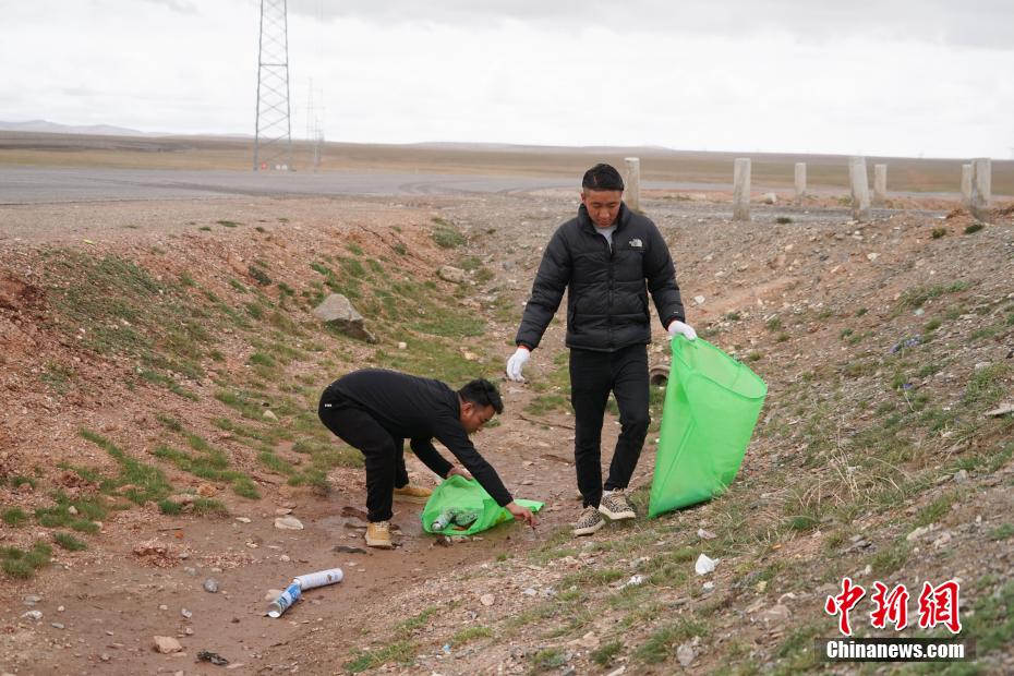 6月20日,三江源國家公園長江源園區(qū)可可西里管理處五道梁保護(hù)站2名生態(tài)管護(hù)員在青藏公路沿線撿拾垃圾。中新社記者 馬銘言 攝